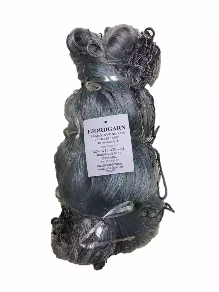 Monter fjordgarnet selv! Et delvis montert fjordgarn med ferdig montert følgeline rundt. Det er bare å feste kork og blyline. Bruk gjerne kork og bly fra gamle utslitte garn.