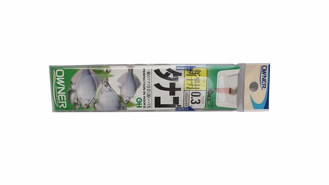 Owner Tanago mikromeite rigger leveres i 2 modeller, Gokusyo og Shinhangetsu som er navnet på tradisjonelle krokformer i Japan. Kroken leveres ferdig knyttet med en 45 cm lang fortom I 0.09mm og krokstørrelsen er oppgitt til A3 som er en Asiatiske betegnelser på krokstørrelse. Her er det nå mulig å servere de minste agnene til de minste fiskene! Kroklengde 7 mm.