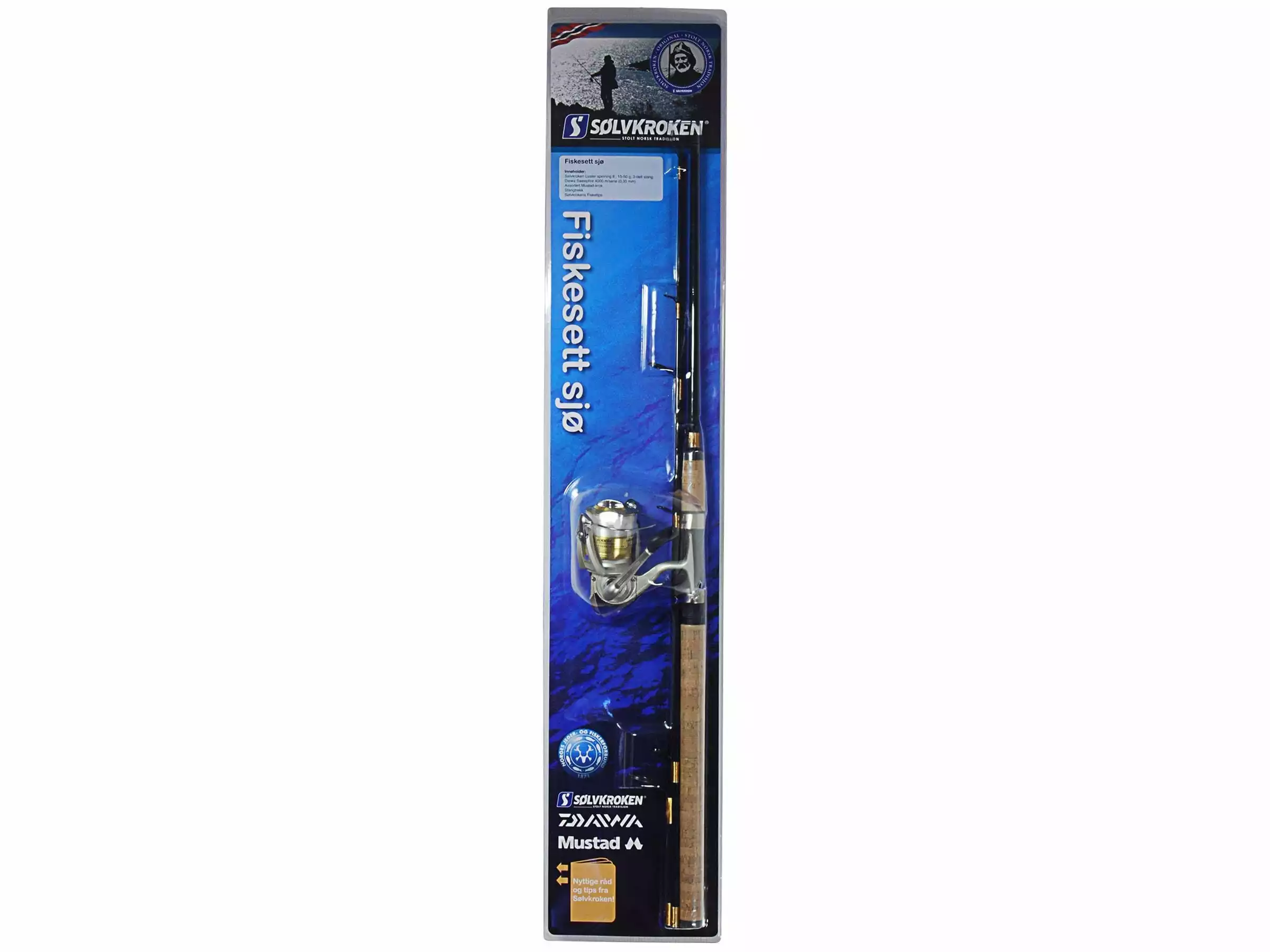 Egner seg til fiske fra svaberg året rundt. I dette settet får du en 8` stang, beregnet for sike med slukvekter fra 15 til 50 gram. Settets snelle, eir 5000, leveres med ferdig påspolt sene. I den lille boken som følger med, “Sølvkrokens Fisketips”, kan du lese mer om forskjellige typer fiske, få gode råd og tips, samt se hvordan du knytter de vanligste knutene mm. I tillegg følger det med en pose assortert Mustad-krok.