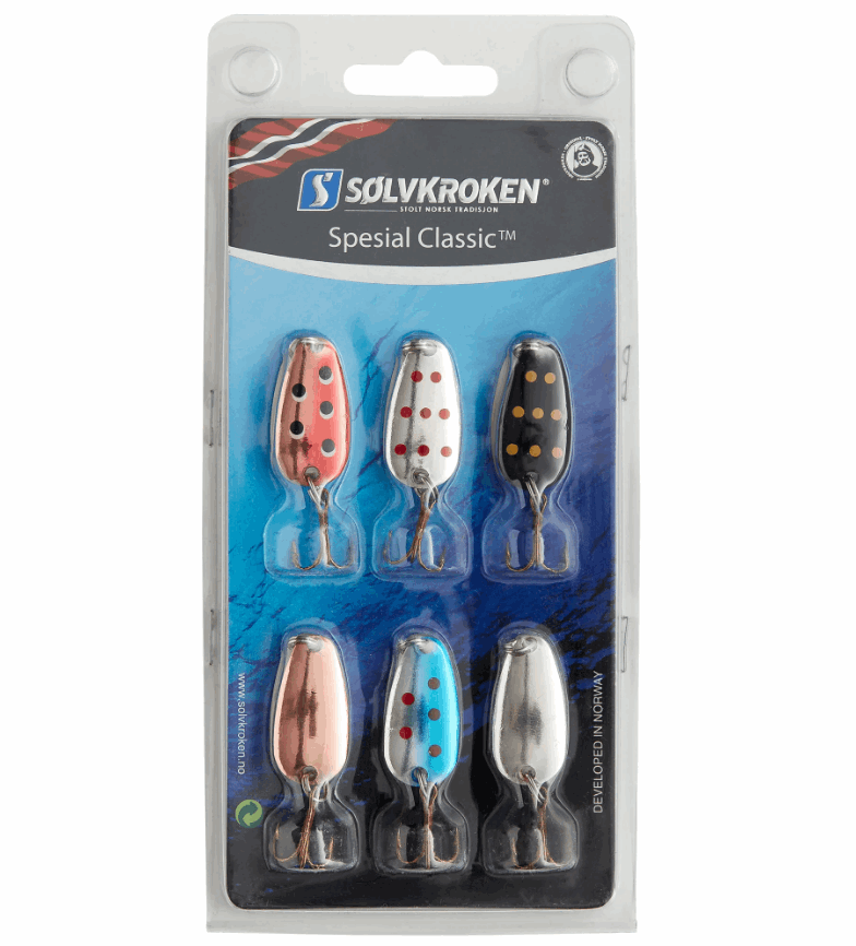 6 pk med seks av Sølvkrokens Spesial Classic-favoritter. Spesial Classic er originalen som fungerer på alt ferskvannsfiske! I dette settet får du seks sluker i forskjellige farger og mønstre, slik at du alltid har en bankers sluk med på tur, uansett forhold.